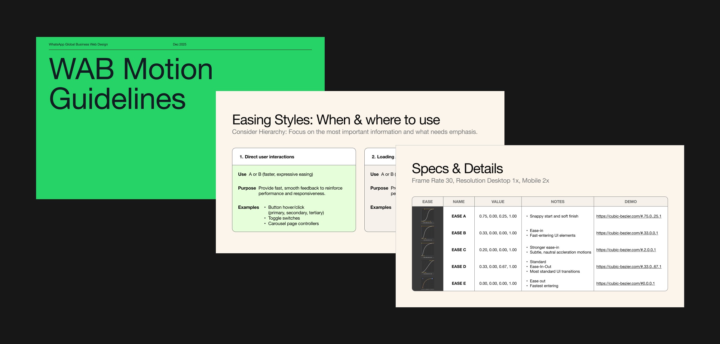 I adapted WhatsApp’s core consumer motion principles to work specifically for a B2B context. By recontextualizing Upward Movement to signal business efficiency and Scale-based Push-ins to represent growth, I built a familiar yet purposeful motion vocabulary that helps users feel the product's benefits as they navigate.